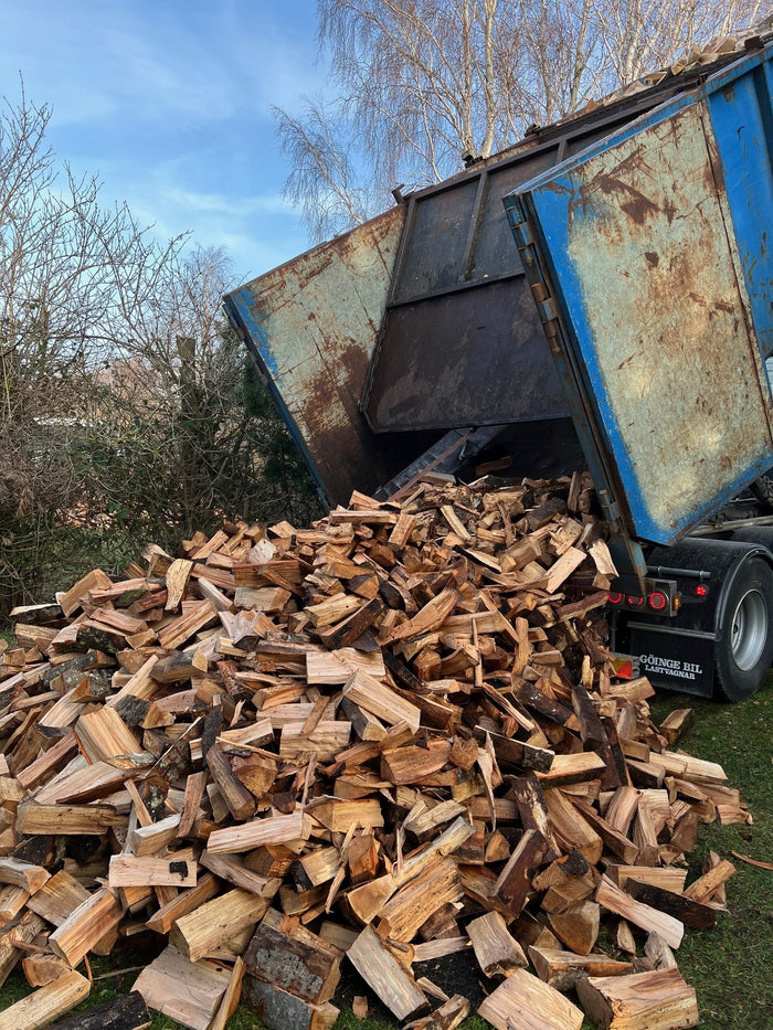 Brændet leveres med tip-lastbil (3 rum à 10rm) – sørg for plads til aflæsning.