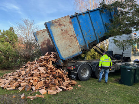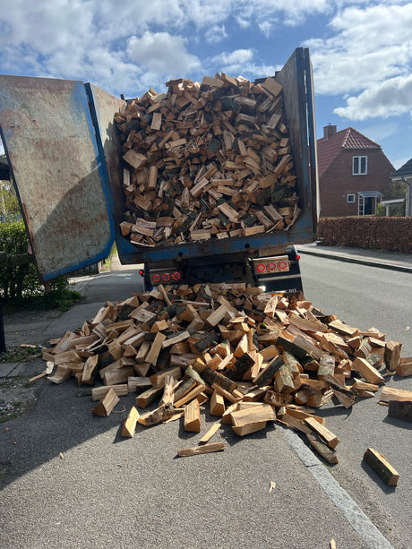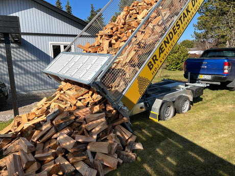 Når du bestiller, leveres brændet direkte på en stor lastbil, der tipper det af for dig. Husk, at der skal være tilstrækkelig plads til lastbilen, der har 3 rum med 10 rummeter brænde i hver.