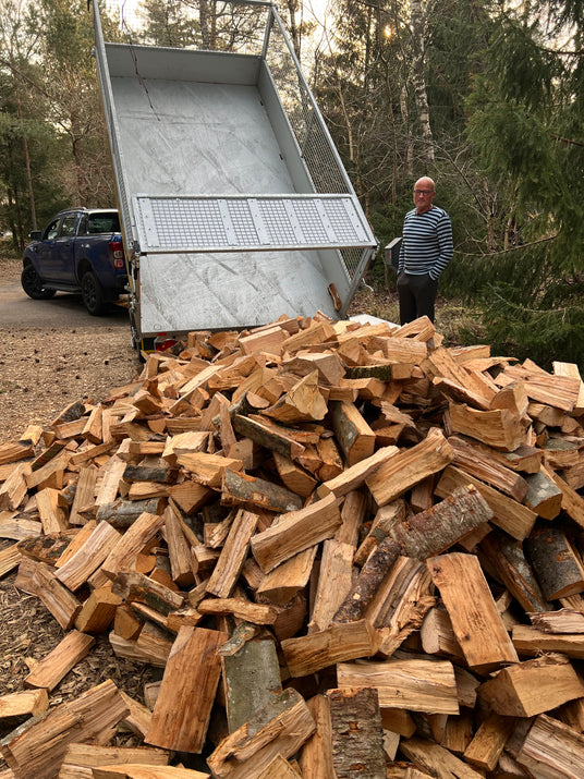 Alt vores brænde bliver skåret og flækket direkte på savværket i Skåne, før det pakkes og leveres til dig.